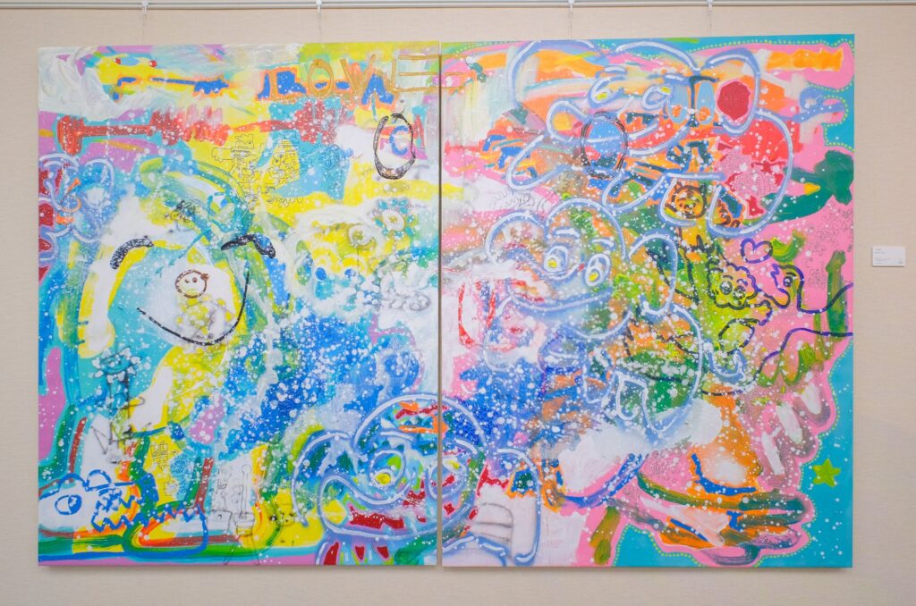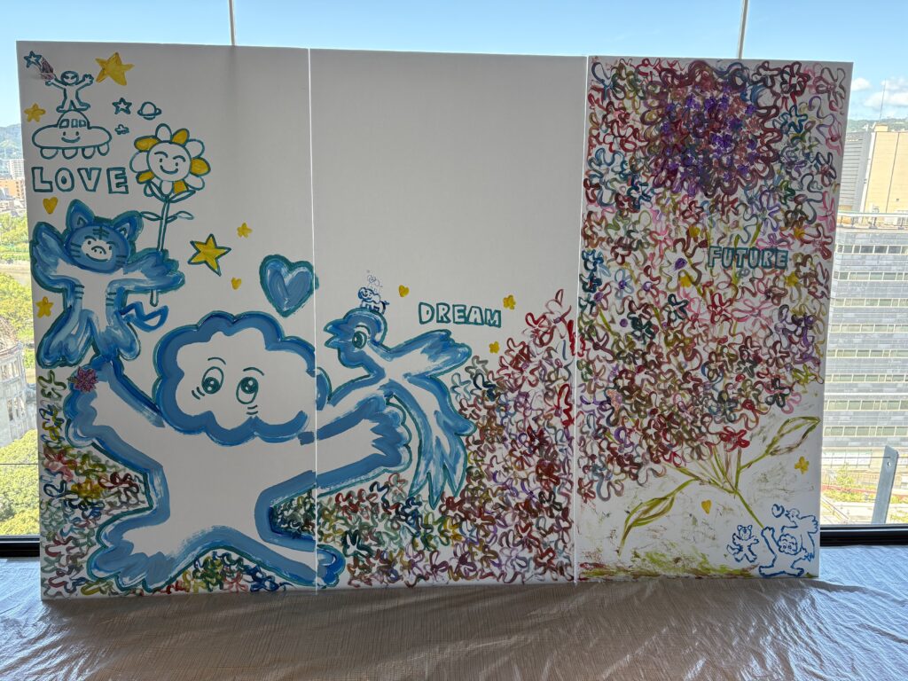 キャンバスには宮本さんが無数の花を描き、右上を中心として花が集まる様子を“おりづるタワー”として表現されています。そして、水色を基調とする大沼さんの絵には、自画像的キャラクターの“クラウドくん”たちが描かれています。キャンバスで左右に分かれる大小2つのクラウドくんたちが、時間の流れや成長している様子、未来に向かって前に進んでいる様子を表現しています。