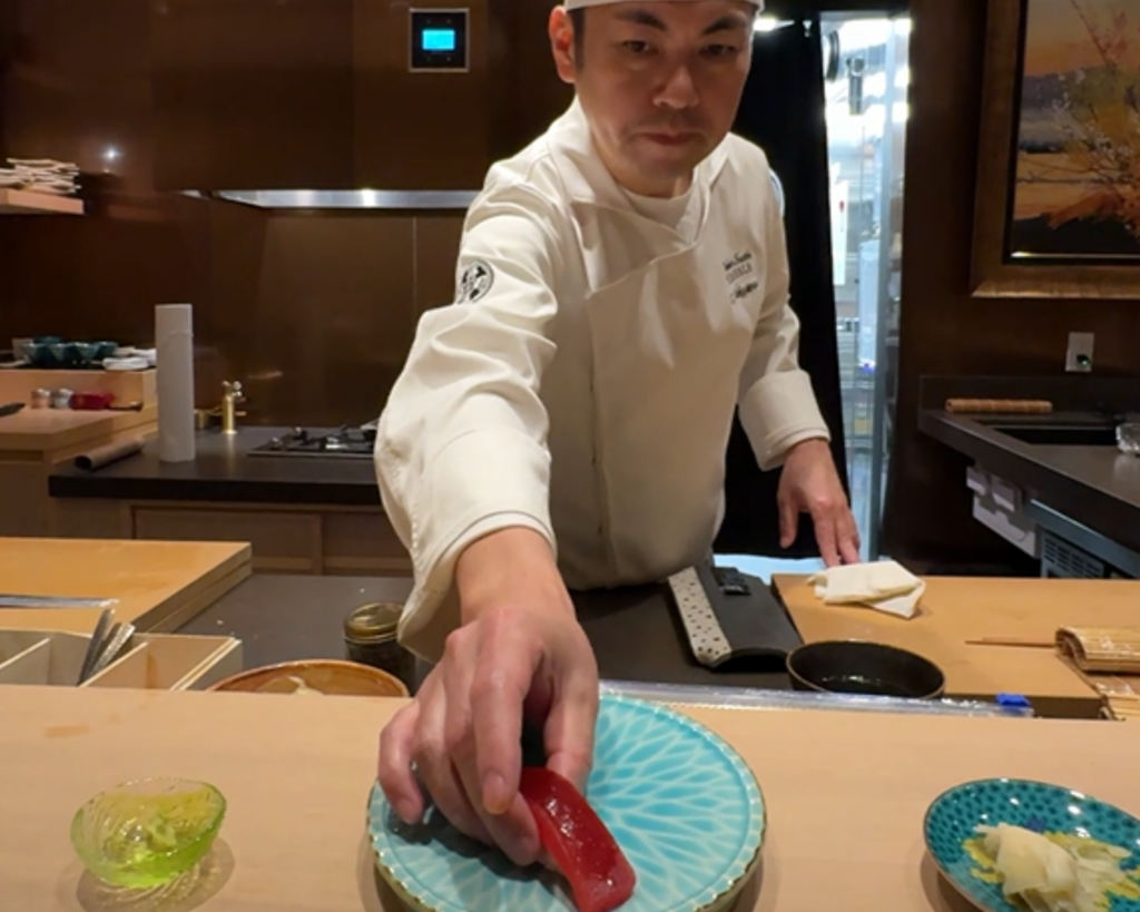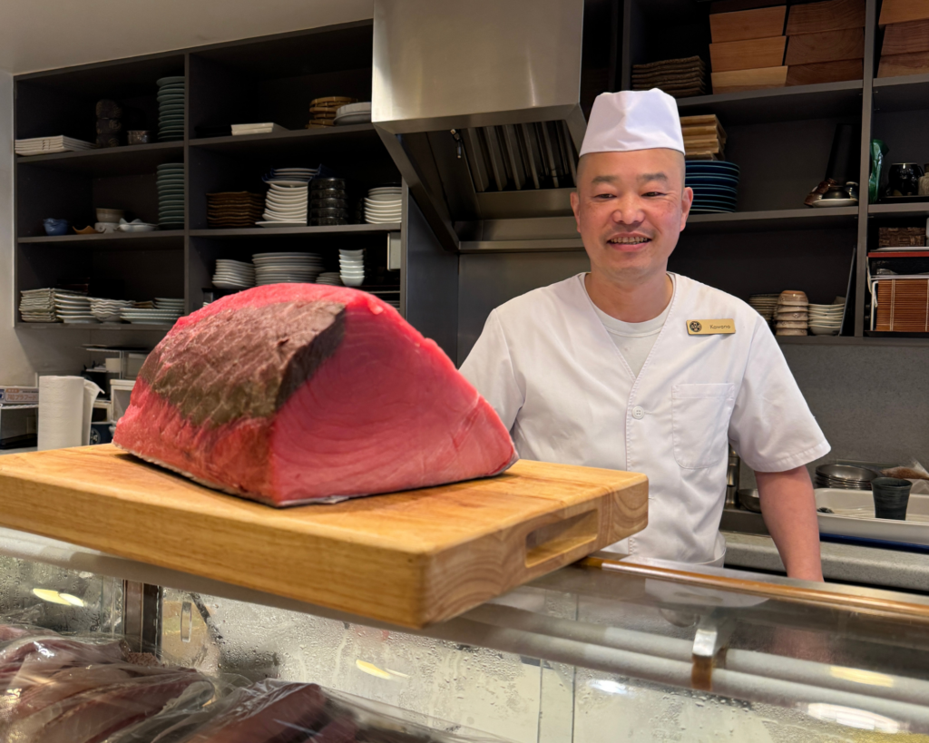 左)日本から直送された本鮪の柵 右)好みの鮨をその場で握ってくれるスタイル